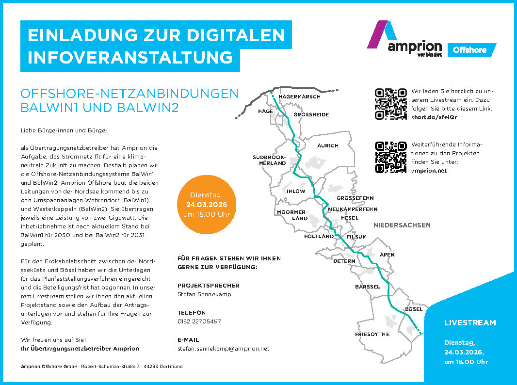 Bekanntmachung im Planfeststellungsverfahren für den Neubau und Betrieb der +/-525 kV-HGÜ-Offshore-Netzanbindungssysteme BalWin1 und 2,