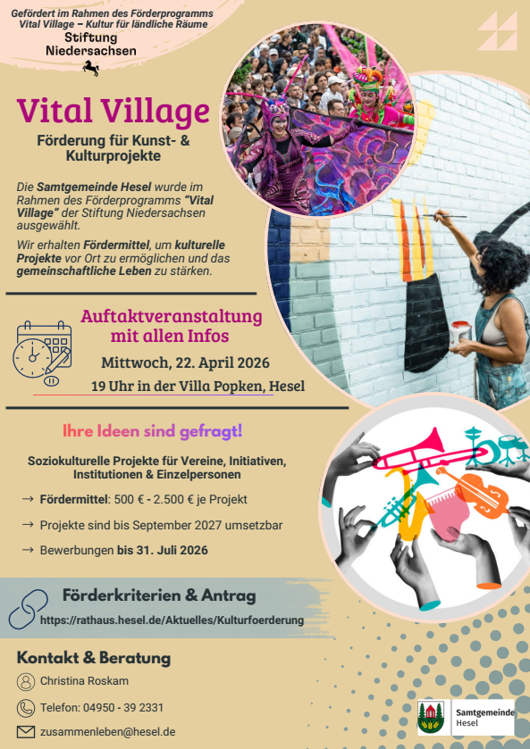 Die Samtgemeinde Hesel ist Teil des Förderprogramms „Vital Village“ der Stiftung Niedersachsen. Ziel ist es, das kulturelle Leben vor Ort zu stärken und neue Projektideen zu fördern.